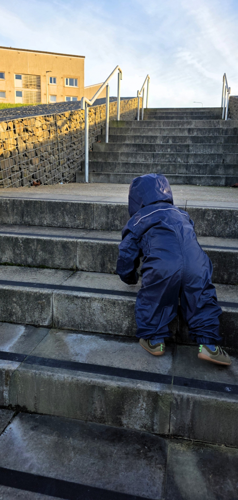 He has only been walking a few weeks, so I watched with interest how he’d master 4 flights of stairs.