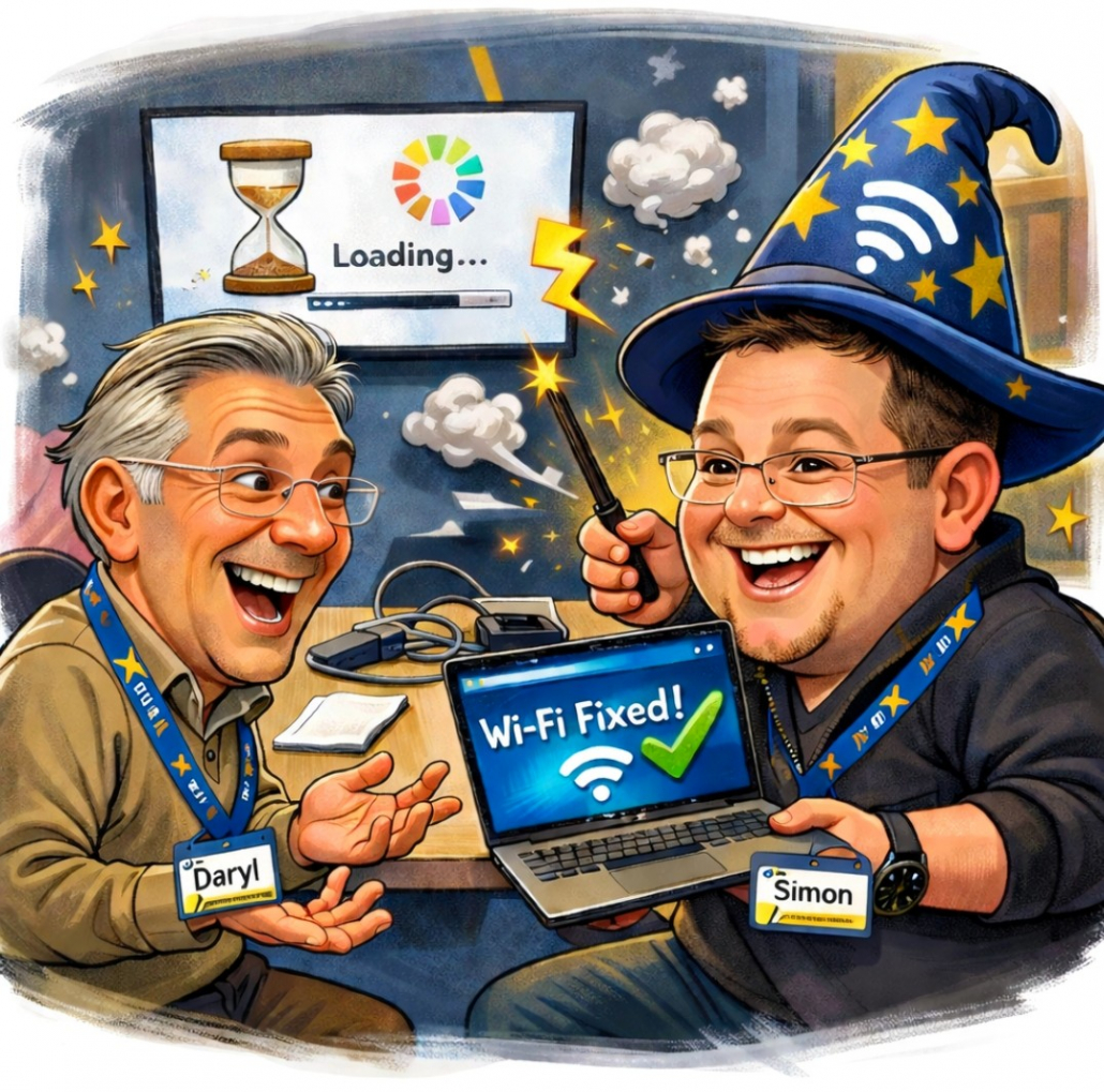 Within a few minutes he’s untangling cables, adjusting settings, installing software, restarting systems or calmly experimenting with another approach until everything springs back to life again.
