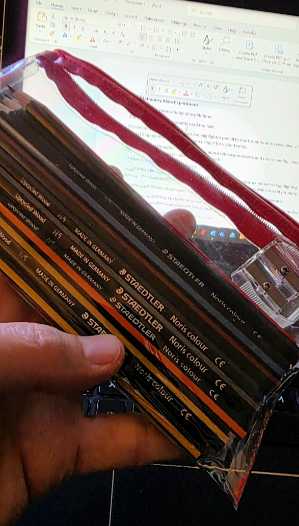 I was in the stationery aisle and decided, for no big reason, to buy a new set of highlighting pencils. And then a pencil case, because once you start, you may as well commit properly.